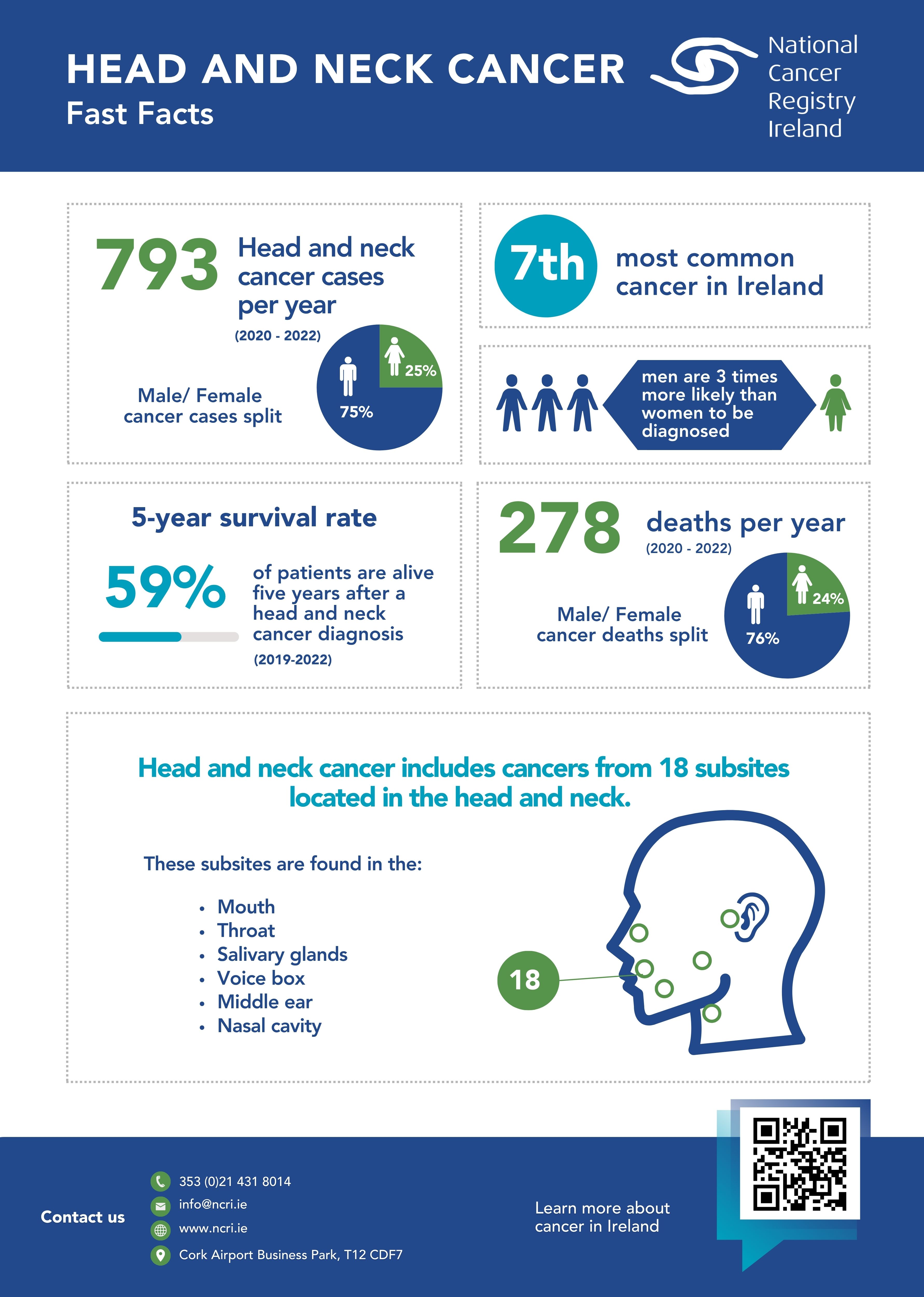 The National Cancer Registry of Ireland (NCRI) collects information from all hospitals in Ireland on the number of persons diagnosed with cancer and the types of cancer they have. NCRI also follows up the numbers dying from cancer or from other causes. All patient personal and private information is removed before summary cancer statistics are prepared and made available to the public and health professionals through the annual cancer report.